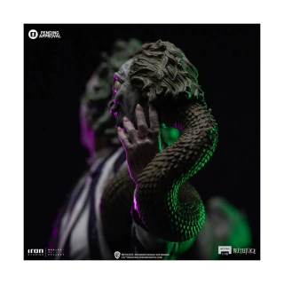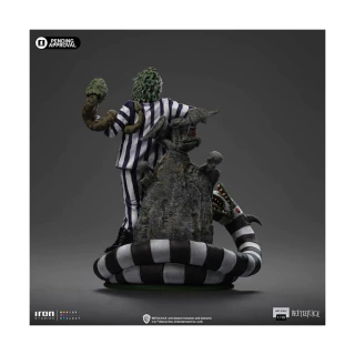 Cercado de referências sobrenaturais de seu fúnebre universo, um fantasma trapaceiro e travesso se diverte rindo abraçado com uma de suas cadavéricas gárgulas de concreto sobre a lápide de seu túmulo. Trazendo em seu braço esquerdo uma cobra monstruosa com uma pequena cabeça semelhante a sua com feições horrendas, forma que ele assume para assustar humanos vivos, o cadáver que come insetos, incluindo moscas e besouros, vestido com um terno listrado branco e preto e calçando coturnos, pisa sobre o corpo enrolado de um chamado verme da areia, uma criatura bizarra, ironicamente com suas cores, oriunda de uma dimensão formada por um estranho deserto, e um dos poucos monstros que ele realmente tem medo. A Iron Studios orgulhosamente apresenta a estátua "Beetlejuice - Beetlejuice Beetlejuice - Deluxe Art Scale 1/10", uma das mais cultuadas e icônicas criações de Tim Burton, que acaba de ganhar uma continuação nas telonas, 36 anos depois de sua estreia em seu primeiro filme.