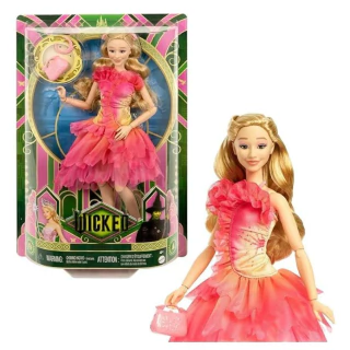 Boneca e acessórios modernos Mattel Universal Wicked Glinda com cabelo loiro, possibilidade e aparência removível de salão de baile. Entre na terra de Oz com a boneca fashion Wicked Glinda! Inspirada na Universal Pictures Wicked, a boneca Glinda usa seu icônico vestido removível rosa ombre com detalhes de babados, saltos e bolsa. Assim como no filme, ela apresenta seus longos cabelos loiros com grampos de cabelo para modelar, além de flexibilidade no torso, cotovelos, pulsos e joelhos para brincar e exibir!