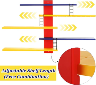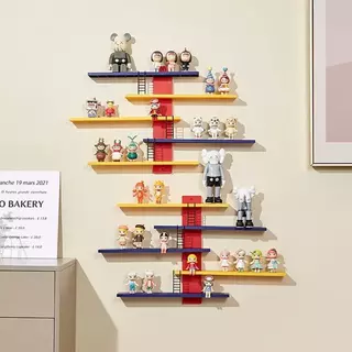 Expositor para fixação em parede, tipo prateleira. Possui 5 prateleiras/níveis e 3 escadas.