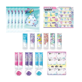 Conteúdo da embalagem: 1 Misturador de slime em forma de batedeira, 1 Cartão de receitas, 6 Pacotes de slime, 6 Pacotes de corantes e 6 Pacotes de decoração.