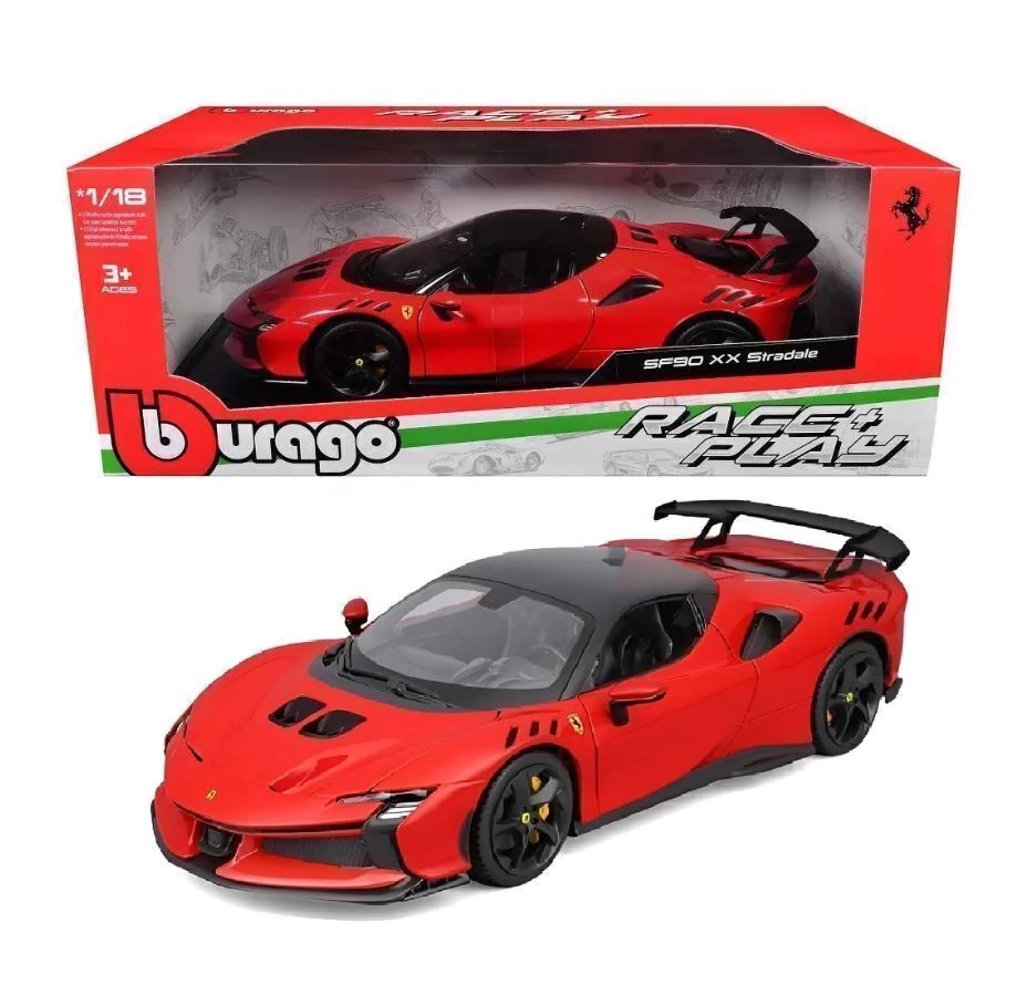 SF90 XX Stradale Marca do produto: Bburago. Escala: 1/18 (aproximadamente 25 cm de comprimento). Pneus de Borracha. Abre portas, capô e tampa traseira. Miniatura em Metal com partes de plástico.