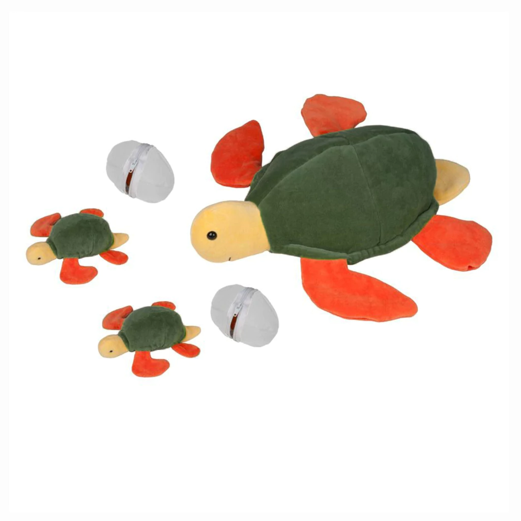 As tartarugas marinhas têm os sentidos muito aguçados e, além disso, se localizam muito bem pois têm uma espécie de GPS interno. Elas nadam a mais de 20 quilômetros por hora e se alimentam de medusas, camarões e águas-vivas. Todas as espécies estão ameaçadas de extinção e de 100 filhotes, apenas 1 atinge a fase adulta. Ajude a preservar e conheça a coleção Bichos Grávidos da Bichos de Pano. Mãe com 44x16x41 e filhote com 15x4x12. Por ser um produto artesanal, pode haver variações nas cores do tecido. Material antialérgico (plush 80% algodão e 20% poliéster) e fibra proveniente de reciclagem de garrafa PET (100% poliéster).